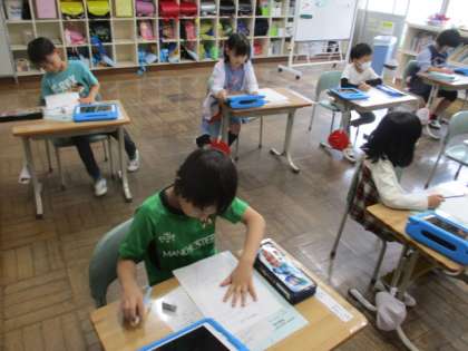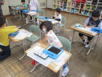 1・2年生の生活科の続きです。端末で撮影したので、教室に戻って画像を見ながら絵を描きます。気付いたことなど一緒に記入しました。
