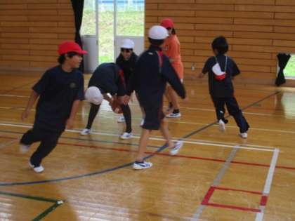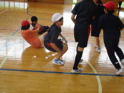5・6年生の体育です。ボールを回す運動を、いくつかの方法で行いました。とても楽しそうに活動しています。