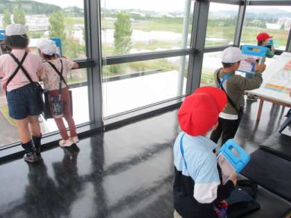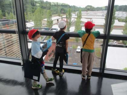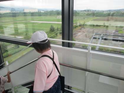 展望室では、農業センターの広い敷地や研究施設を一望することができました。端末で撮影し、帰りはらせん状の階段を降りました。