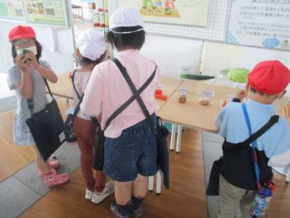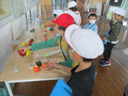 最後に展示物を自由に参観しました。子ども達は野菜の模型に興味をもち、触ったり手にとったりしていました。