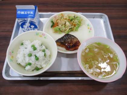 今日の給食はグリンピースご飯、牛乳、さばの照り焼き、かぶとキャベツのしょうゆ漬、大根のみそ汁です。大変おいしかったです。