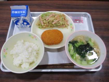 今日の給食の献立は、ご飯、牛乳、コロッケ、はるさめのこまずあえ、青菜のみそ汁です。