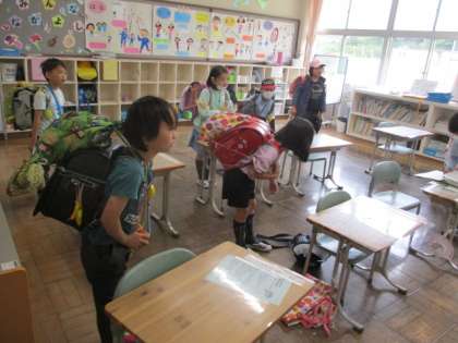 そして、いよいよ19日(月)は陸上交歓会になります。5・6年生の皆さんは、自己ベストを目指して全力で頑張ってほしいと思います。なお、6年生が班長を務める登校班は、班旗が3・4年生に渡されました。