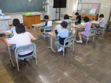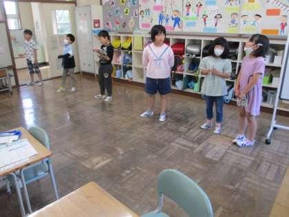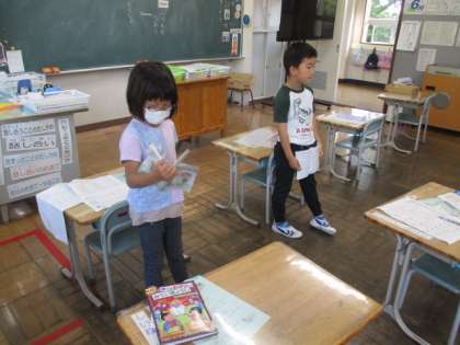 今月の歌は「歌えバンバン」です。1・2年生の教室では、1年生と2年生が対面し元気に歌っています。歌い終わった後は読書に取り組みました。
