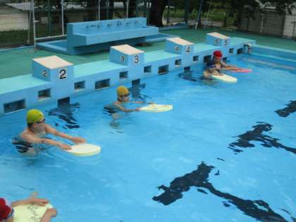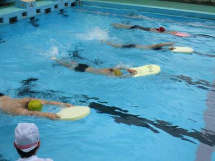 3・4年生の水泳の授業の続きです。ビート板を使ってクロールの練習を行いました。