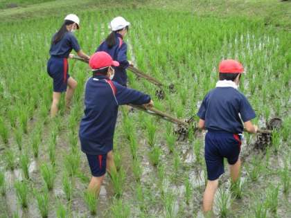農業センターの方から、「田打ち車」を用いた除草方法を具体的に説明していただいた後、子ども達が実際にやってみました。前に進まない様子も見られましたが、楽しみながら取り組んでいました。