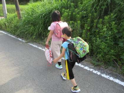 今朝は日射しがまぶしく、朝から蒸し暑くなりました。子ども達は元気に登校していました。