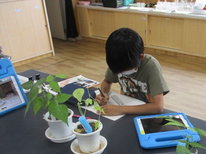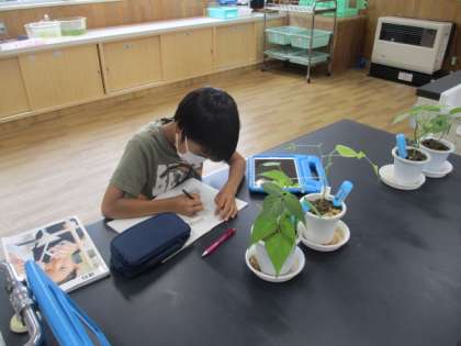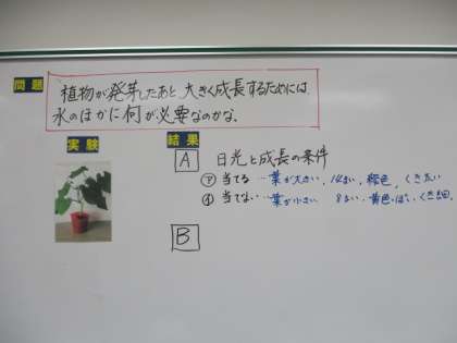 5年生の理科です。日光を当てた植物と当てなかった植物の生長を比べました。日光を当てなかった方は、あまり育っていないことがわかります。