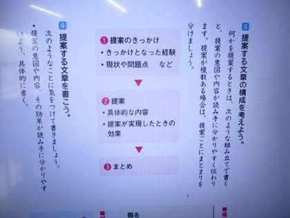 6年生の国語です。提案する文章の構成について考えています。友達と話し合いながら進めています。