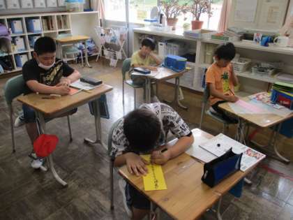 3・4年生です。七夕集会に向けて、願い事を記入しています。今まで多くの人が願い事を書き出し、夢を叶えてきました。どのような願いを書いたのでしょうか?