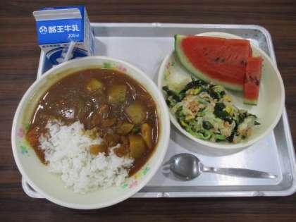 今日の給食の献立は、ハヤシライス、牛乳、わかめとツナのサラダ、小玉すいかです。