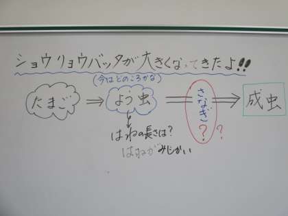 3年生の理科です。ショウリョウバッタが大きくなりました。ショウリョウバッタの抜け殻を発見し、大変驚きました!