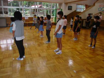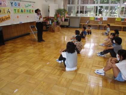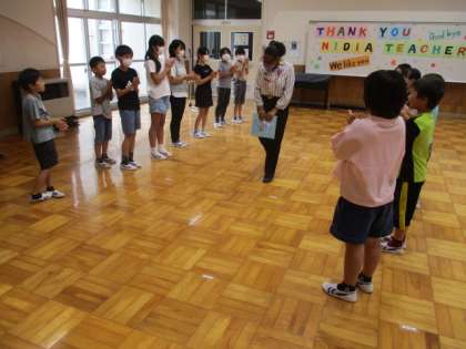 AETの先生からご挨拶をいただいた後、全員で校歌を歌いました。最後はAETの先生を拍手でお送りしました。