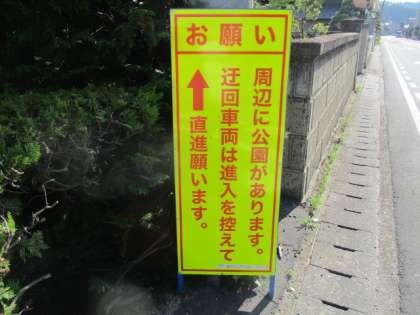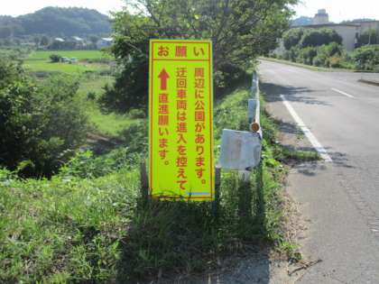 五百川橋の工事が始まってから高倉公園脇道路を通る車が増え、現在も朝と夕方は交通量が多く、車が頻繁に通過しています。工事による迂回路は直進となっているので、表示を設置していただきました。夏休みが近づいてきたので、高倉公園で遊ぶ際には車に十分に注意するよう事前指導をしっかり行いたいと思います。