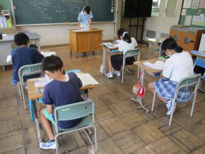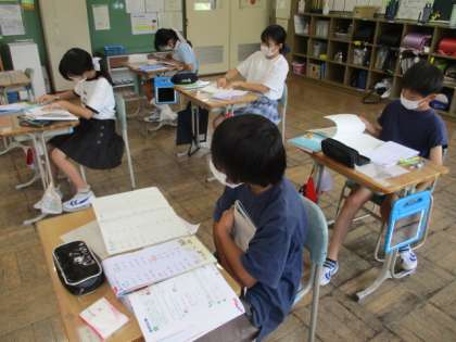 6年生の算数です。計算問題を行い、丸付けは自分で行っています。