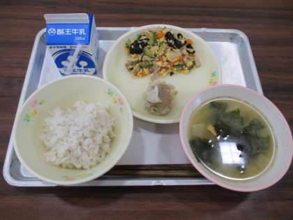今日の給食の献立は、麦ご飯、牛乳、シューマイ、ゴーヤの炒め物、生揚げとわかめのみそ汁です。