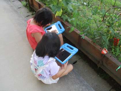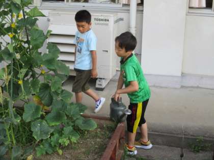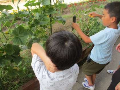 1・2年生が、キュウリの収穫や観察、水やりを行っています。