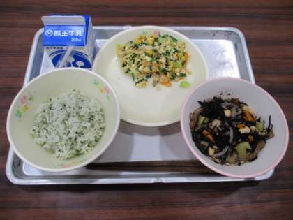 今日の給食の献立は、菜めし、牛乳、ひじきの煮物、ほうれん草と玉子のあえものです。