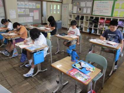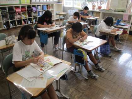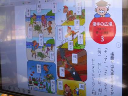 4年生の国語です。漢字の復習を行った後、つなぎ言葉を使って昔話を完成させることをめあてに、学習に取り組みました。