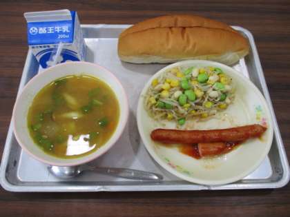 今日の給食の献立は、ドックパン、牛乳、フランクフルトのケチャップソース、豆サラダ、ピーマンとベーコンのみそカレースープです。