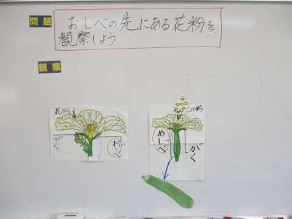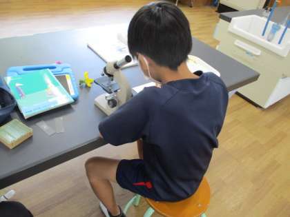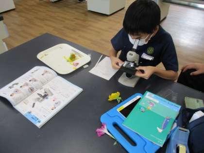 本日の授業の様子を一部お届けします。5年生はヘチマの花粉を顕微鏡で観察しました。