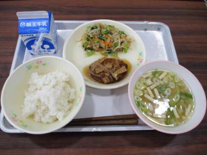 今日の給食の献立は、ごはん、牛乳、ハンバーグきのこソースがけ、三色おひたし、じゃが芋と豆腐のみそ汁です。