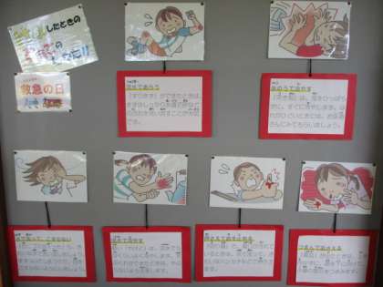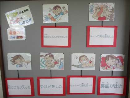 9月9日の「救急の日」に関連させ、保健室廊下には、転んですりむいた・やけどをした等の際に、どのように対処すればよいか掲示してあります。ケガをしないことが1番ですが、ケガをした際には応急処置を迅速に正しくできるようにさせたいと思います。