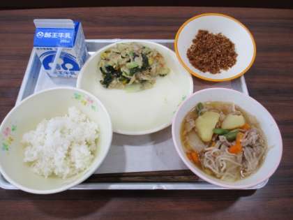 今日の給食の献立は、ごはん、かつお手づくりふりかけ、牛乳、肉じゃが、シーチキンあえです。