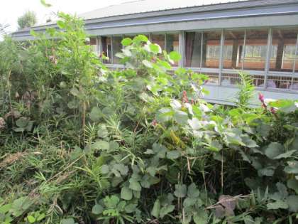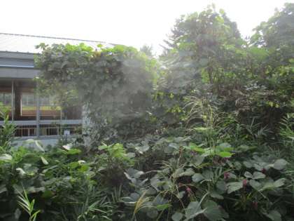 体育館の西側に田んぼがありますが、斜面に葛の葉が茂り、花が咲いています。