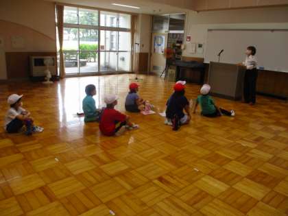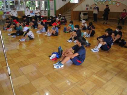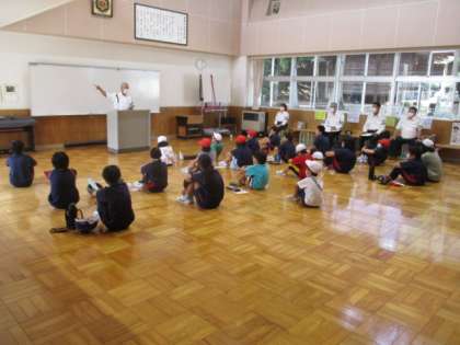 今日は郡山市市民部セーフコミュニティ課交通専門員の皆様にお越しいただき、「安全な自転車の乗り方・歩き方」について指導していただきました。暑さ対策のため、始めと終わりの全体会をレインボー広場で行いました。