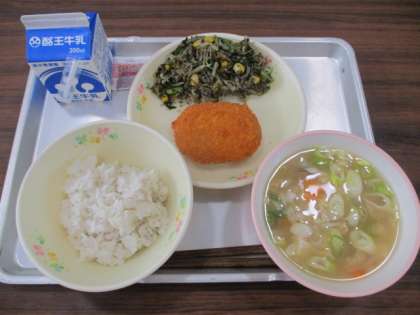 今日の給食の献立は、麦ご飯、牛乳、コロッケ、小松菜ののりあえ、きのこ汁です。