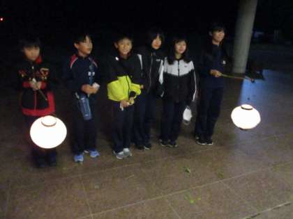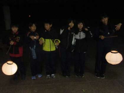 強い風が吹きましたが、時間を前倒ししてナイトハイキングを実施しました。転倒によるケガ等を防ぐため、チェックポイントでは先生方が子どもたちと一緒に歩くようにしました。提灯を持って全員が一緒に出発です。