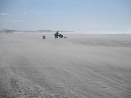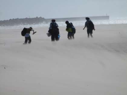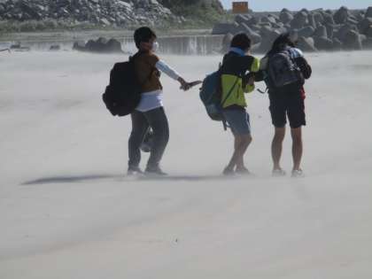 風が強くなり砂が舞う中、海岸駐車場まで戻りました。風に背中を向けて歩いています。耳の穴やデジタルカメラのバッテリーの隙間にも砂が入り込みました。
