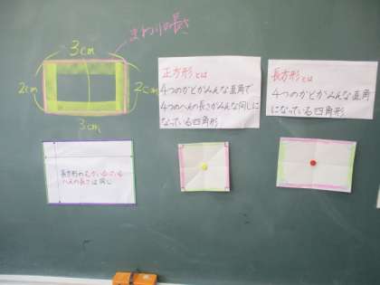 2年生の算数の授業です。四角形のまわりの長さを求める学習をしました。