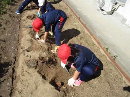 1・2年生では、生活科の時間にサツマイモ掘りを行いました。サツマイモの生育は昨年度と同様に良好で、豊作でした。