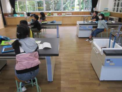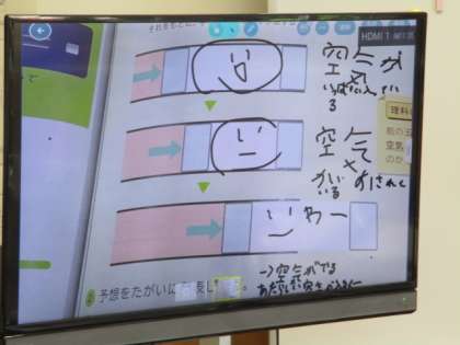 4年生の理科の授業です。閉じ込められた空気について学習しています。注射器を使って、実験方法を考えました。