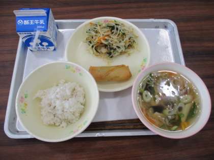 今日の給食の献立は、麦ご飯、牛乳、春巻き、ほうれん草のあえもの、ワンタンスープでです。