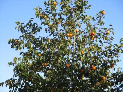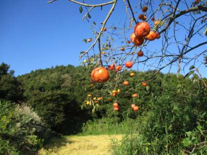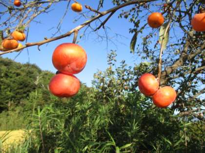 今朝は晴れて気持ちのよい青空が広がっていました。館山には橙色の柿の実がたくさん実っていました。