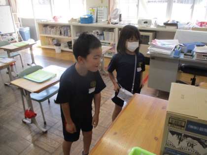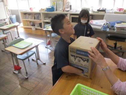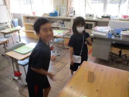 本日の授業の様子を一部お届けします。1年生の算数です。どんな形をしているか、手触りで考えました。見事正解です。