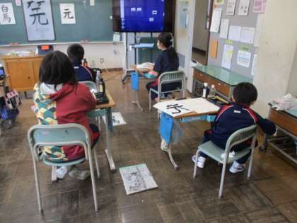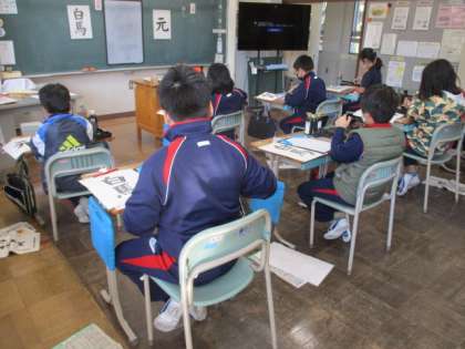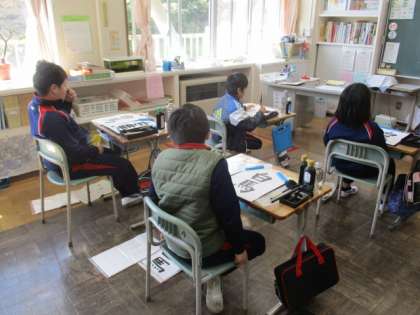 3・4年生の書写の授業の続きです。1枚書いた後に難しかったところを話し合いました。注意点を確認したら、練習開始です。