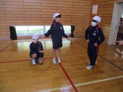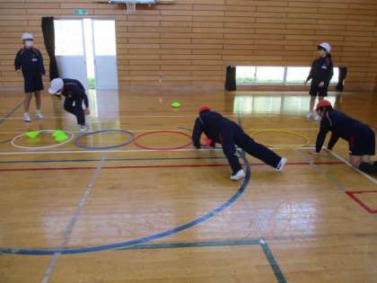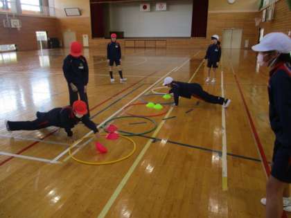 5・6年生の体育の授業の続きです。腕立て伏せの姿勢でカラーコーンを動かすのは結構大変でした。1回目は白組の勝利に終わりましたが、ここで作戦タイムです。どうすればスムーズにカラーコーンを移動できるのか、話し合いました。