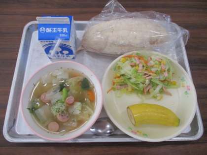 今日の給食の献立は、きな粉揚げパン、牛乳、ポトフ、キャベツサラダ、バナナです。