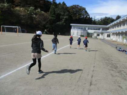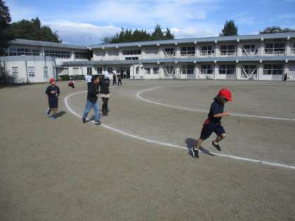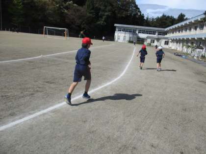 気持ちのよい晴天のもと、子どもたちは自分のペースで走っています。