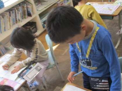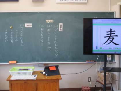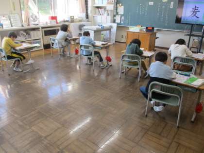 今日の授業の一部をお届けします。1・2年生の国語です。1年生は作文の直しを行っています。2年生は漢字の学習に集中して取り組んでいます。