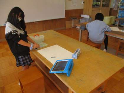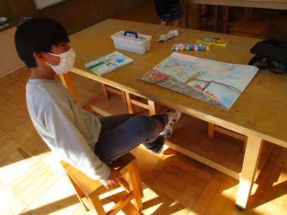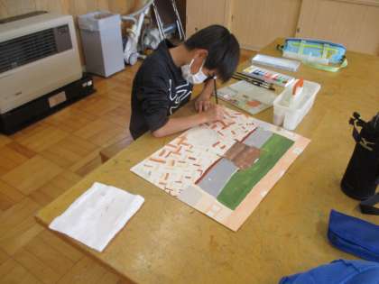 5・6年生の図画工作の授業です。絵の具で、ていねいに色を塗っています。