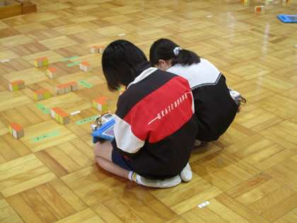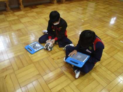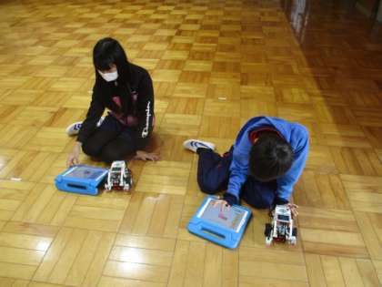 今日の授業の様子を一部お届けします。5・6年生ではレゴマインドストームを使って、迷路を通るようにプログラミングをしました。