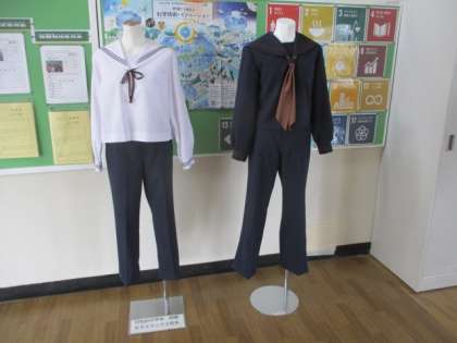 中学校の女子の制服の見本です。女子もスラックスを選択することができます。