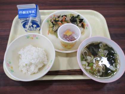 今日の給食は、朝食モデル献立です。メニューは、ご飯、牛乳、納豆、野菜炒め、じゃが芋とわかめのみそ汁です。