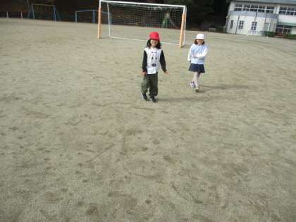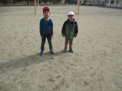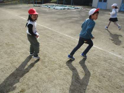 業間の様子です。朝の霧は晴れて、校庭は太陽に照らされています。元気におにごっこを行いました。