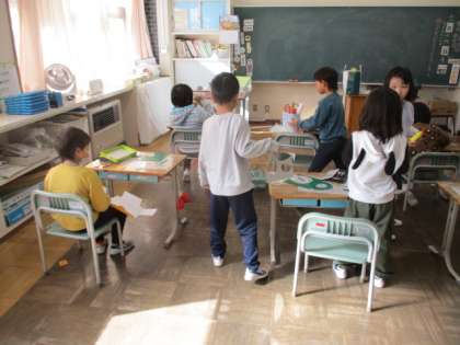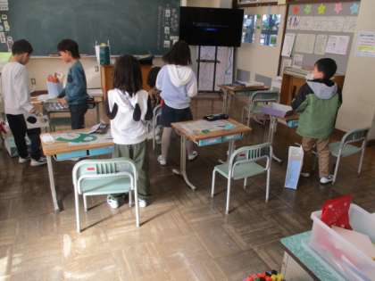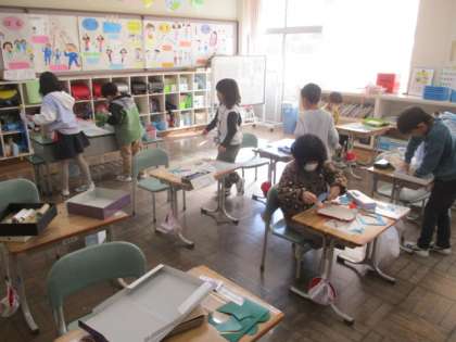 1・2年生の図画工作です。友達と話し合いながら制作を進めています。